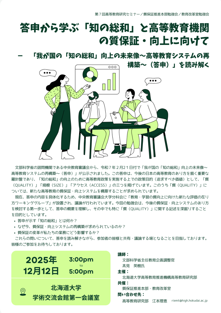 第7回高等教育研究セミナー/質保証推進本部勉強会/教育改革室勉強会「答申から学ぶ「知の総和」と高等教育機関の質保証・向上に向けて」開催のおしらせ